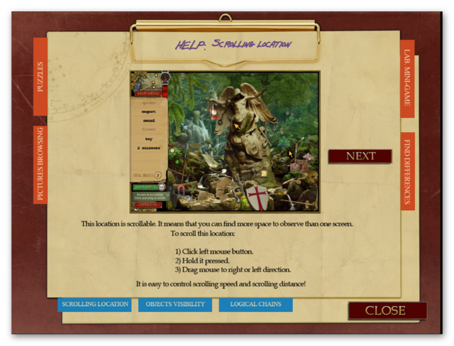 This is one of those scrolling games, in each scene where you are looking for hidden objects. I've noticed some misspellings, and mislabeling: a broom is labeled a mop, a ruler is a tape measure, a paper target is a paper wheel. Other than that, it's an okay game. I prefer hidden object games, and I have never played this one before.